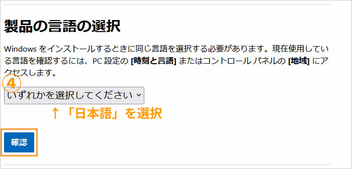 「製品の言語の選択」がでてきたら[日本語]を選択し、[確認]をクリックします。