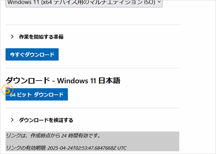 「ダウンロードーWindows11 日本語」が表示されたら、[64ビット ダウンロード]をクリックします。