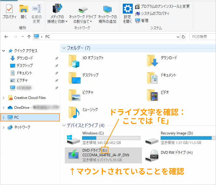 エクスプローラー内の「PC」をクリックし、ISOファイルがマウントされていることを確認し、割り当てられているドライブ文字を確認します