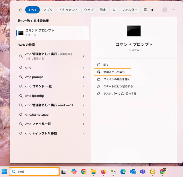 検索バーに「cmd」と入力し、コマンドプロンプトを[管理者として実行]します