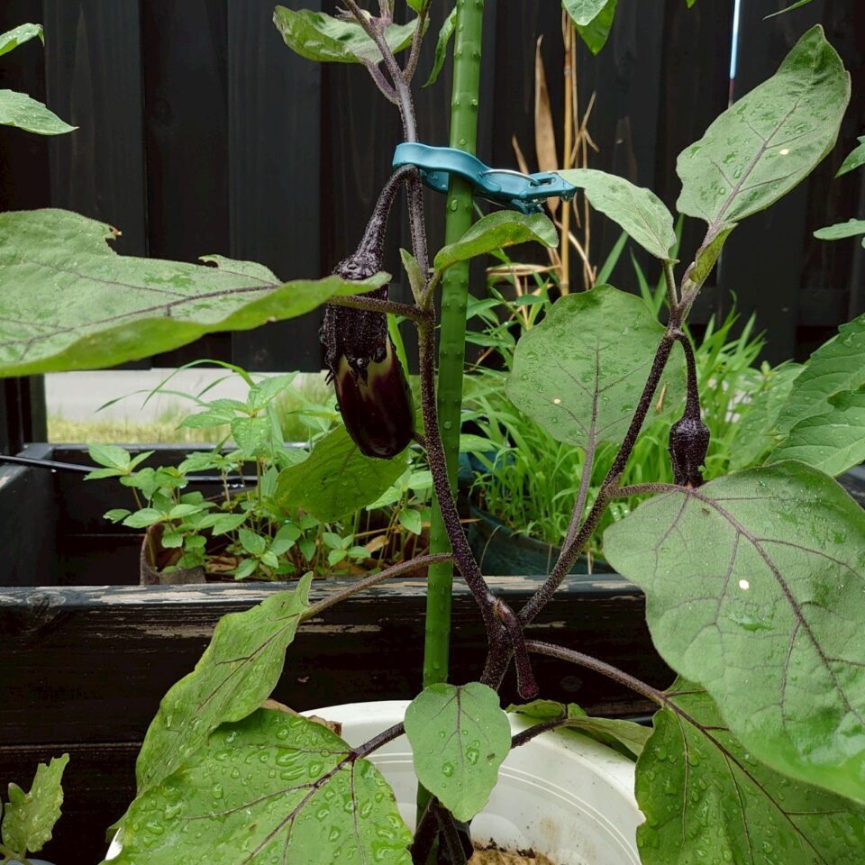 1番花を摘み取らなかったため立派ななすに育ったのですが、土につきそうなためここで収穫。(実際の収穫日は7/1でした。)